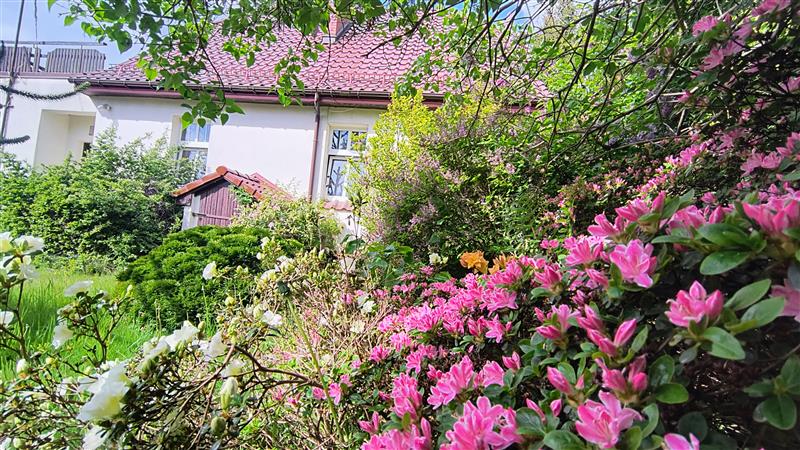 Działka o powierzchni 680m2, w kształcie zbliżonym do prostokąta, w całości ogrodzona, trawnik i nieliczne nasadzenia w tym: piękne, wieloletnie magnolie, azalie japońskie, różaneczniki, lilaki, kalina, egzotyczna kilkumetrowa araukaria oraz krzewy, uzbrojona jest we wszystkie media, budynek wyposażony w instalację elektryczną, wodną, kanalizacyjną i gazową.