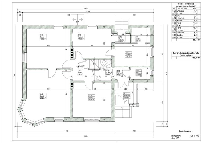 PARTER (98,34m2) : 3 pokoje o pow. 23,21m - w pokoju kominek; 18,5m; 14,43m; kuchnia 11,98m; łazienka 8,59m; wc 2,55m; wiatrołap 4,73m; garderoba 2,86m oraz klatka schodowa, komunikacja i schody drewniane prowadzące na poddasze użytkowe.