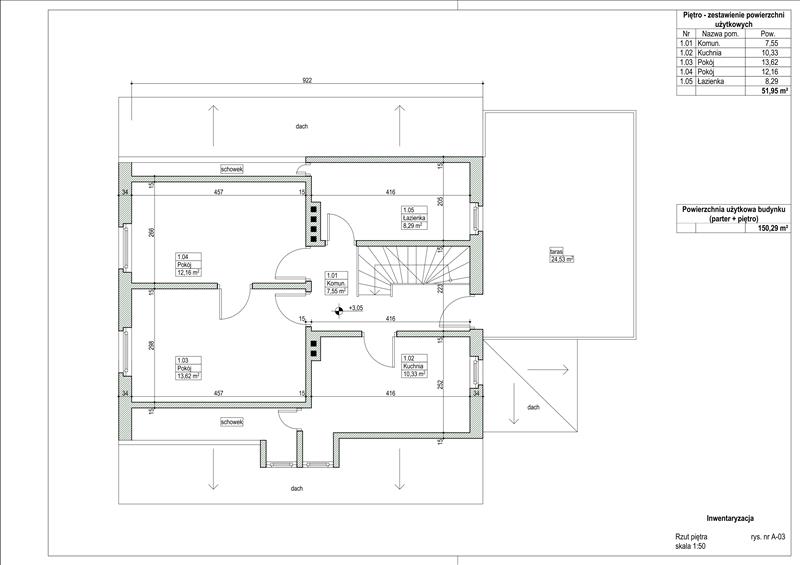 PODDASZE UŻYTKOWE (51,95m2): 2 pokoje ze skosami- 13,62m i 12,16m, kuchnia 10,33m2, łazienka 8,29m, komunikacja .