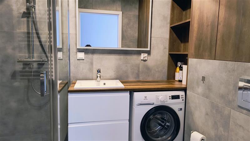 W łazience kabina prysznicowa, pralka.