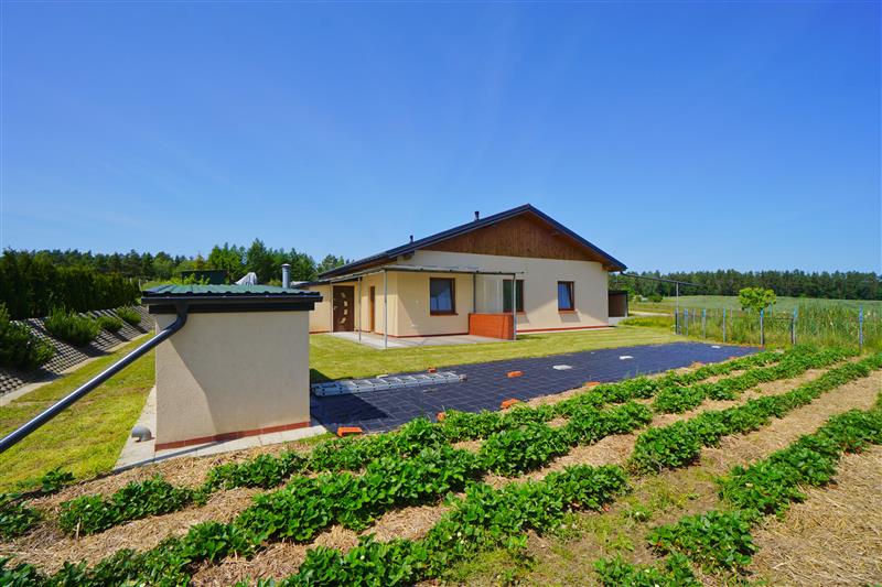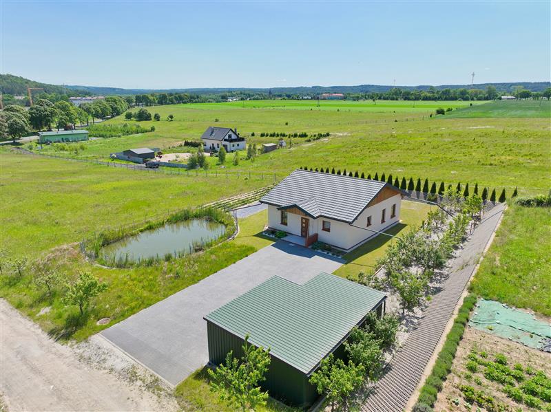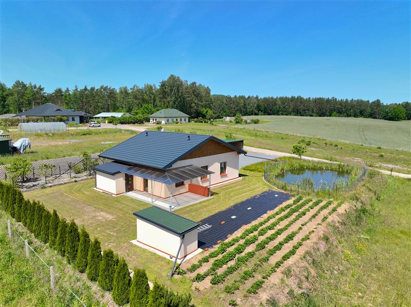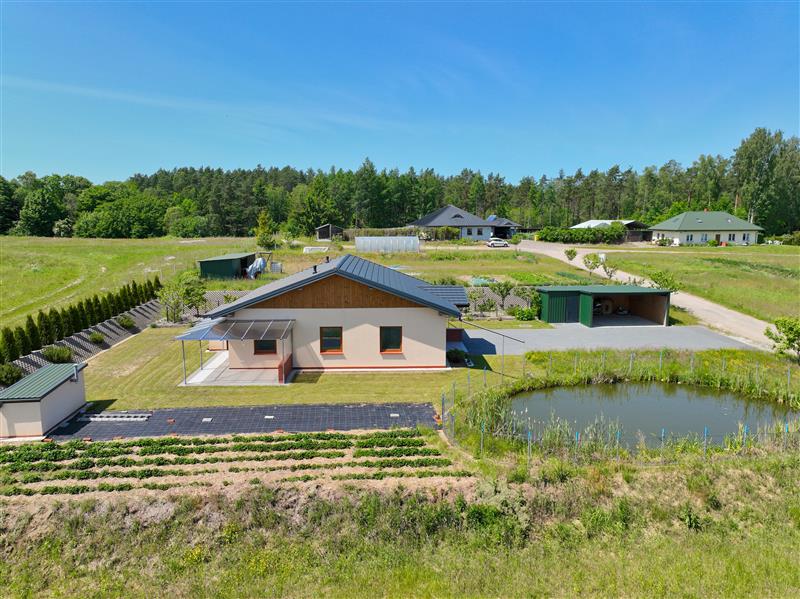 Przedmiotem sprzedaży jest parterowy dom jednorodzinny, wolnostojący sprzedawany w stanie deweloperskim o powierzchni całkowitej 83,40 m2, posadowiony na przestronnej i w pełni zagospodarowanej działce o powierzchni 1500 m2. Dodatkowym atutem nieruchomości jest murowana piwnica na terenie działki, wiata garażowa oraz oczko wodne.