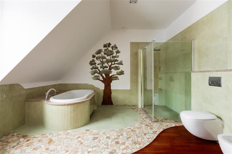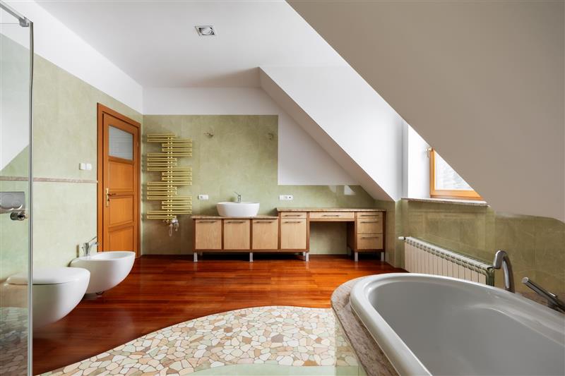 a/ osobna łazienka z dużym oknem (wanna, duży prysznic z hydromasażem, umywalka z szafkami i blatem marmurowym, wc, bidet)