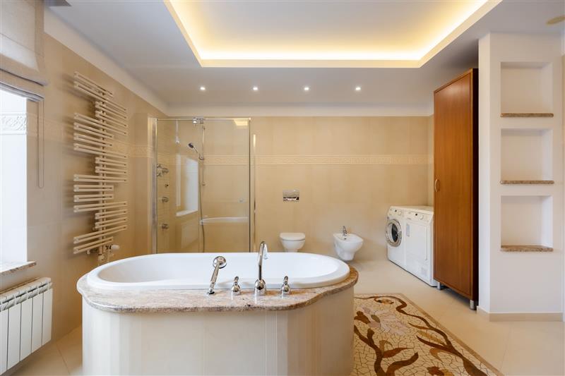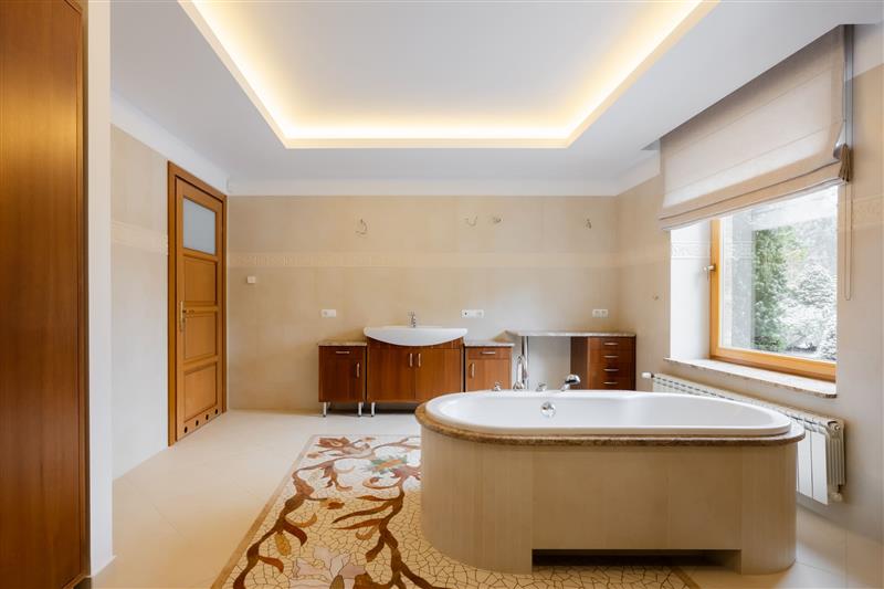 - Łazienka (wanna, z osobną dużą kabiną prysznicową z hydromasażem, wc, bidet, umywalka oraz szafka z blatem marmurowym)