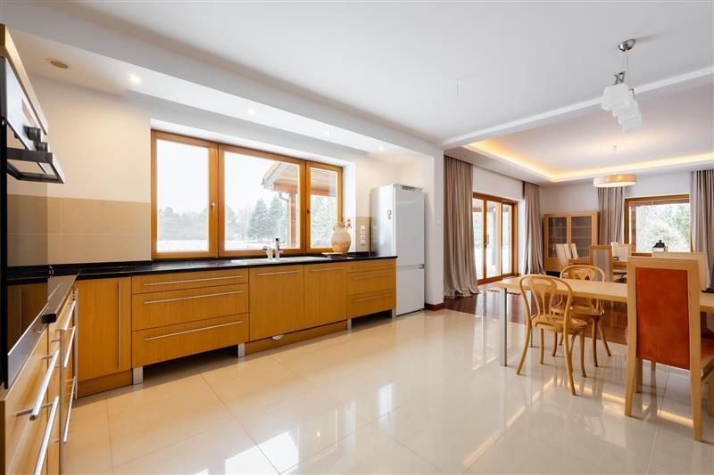 c/ osobna garderoba - Kuchnia z dużym oknem i z widokiem na ogród, połączona z hallem i z salonem. Z kuchnią jest połączona również bardzo poręczna i praktyczna ciemna i chłodna spiżarnia. Spiżarnia wyposażona jest w zlew warzywny oraz regały. Cały sprzęt AGD z firmy MIELE