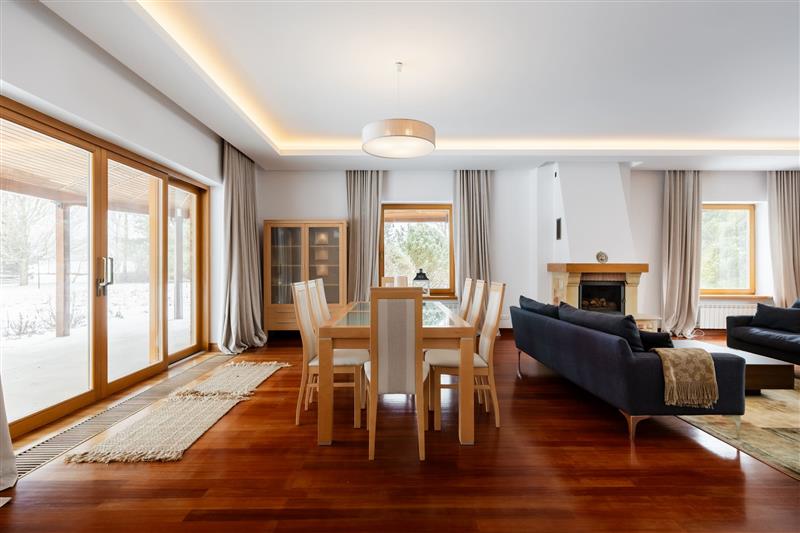 - Salon – otwarte wejście z hallu, połączony z kuchnią pełen obieg słońca, wyjście na duży taras i ogród, okna z 3 stron, kominek. Dla amatorów osobnej kuchni jest możliwe bardzo łatwe oddzielenie jej od salonu poprzez różne rozwiązania.