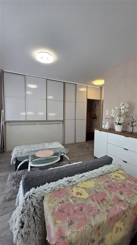 Mieszkanie składa się z przestronnego pokoju z aneksem kuchennym. Wnętrze zostało zaprojektowane z myślą o wygodzie – zastosowano nowoczesną zabudowę, która sprytnie ukrywa łóżko, dzięki czemu przestrzeń w ciągu dnia pozostaje otwarta i estetyczna. Dodatkowo w salonie znajduje się zestaw wypoczynkowy z rozkładaną kanapą.