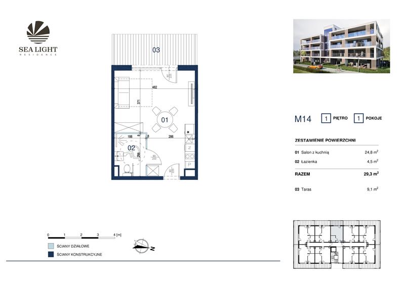 Prezentujemy dwupokojowy apartament o powierzchni 29,30 mkw z tarasem położony na pierwszym piętrze.