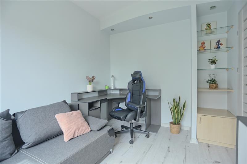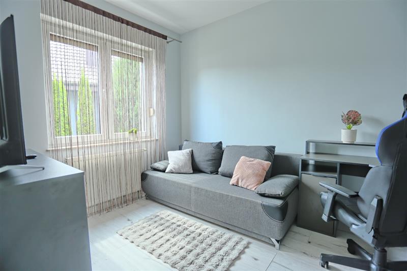 Działka o powierzchni 379 m2 obsadzona jest wysokimi tujami, które gwarantują prywatność. Na terenie posesji znajduje się także mała, zadaszona wiata – idealna na grilla, rowery czy sprzęt ogrodowy.