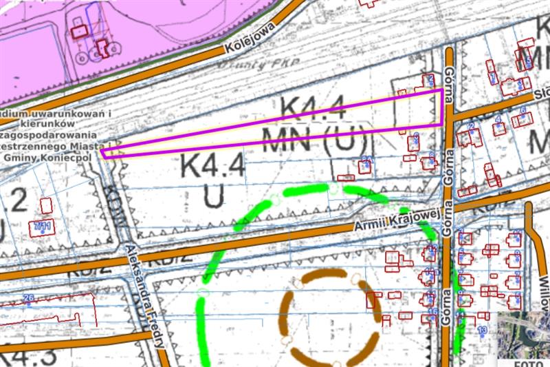 2. Działka o powierzchni 5164 m2 znajdująca się obok skrzyżowania ulicy Górnej oraz Armii Krajowej, w kształcie trójka o podstawie od ulicy Górnej około 30 metrów, w MPZP przeznaczona pod: teren o powierzchni ok. 1100 m2 pod budownictwo mieszkaniowe jednorodzinne, reszta działki po powierzchni około 4000 md usługi, ze względu na kształt działki ewentualne wykorzystanie terenu pod usługi to maksymalnie około 1500 m2. Działka zadrzewiona. W ulicy Górnej znajdują się: woda, prąd i kanalizacja.