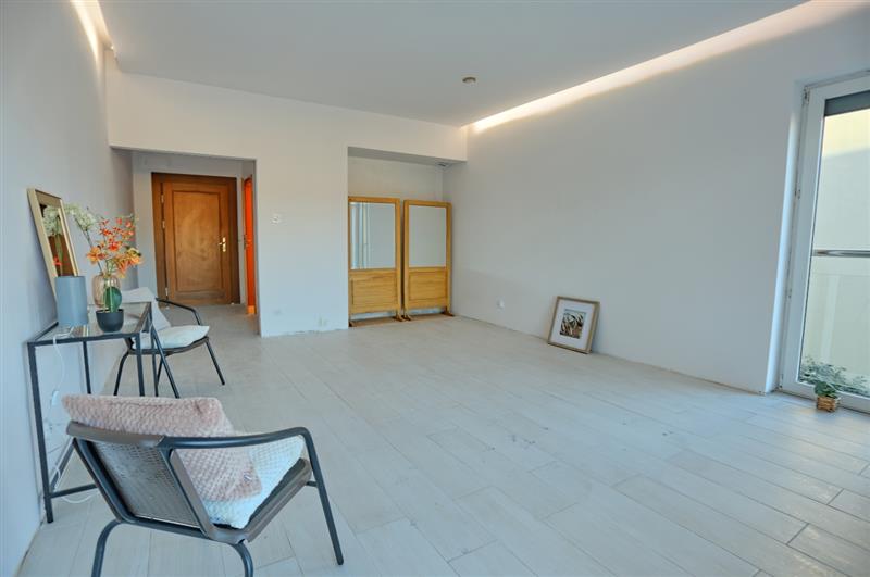 Wnętrze lokalu zostało zaprojektowane w sposób prosty i funkcjonalny. Główną część stanowi duży pokój z aneksem kuchennym, który pozostaje do wyposażenia we własnym zakresie.