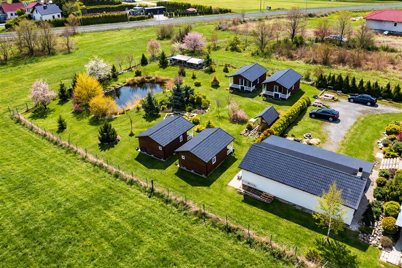 Na drugiej części działki znajdują się 4 w pełni wyposażone domki letniskowe z tarasami.