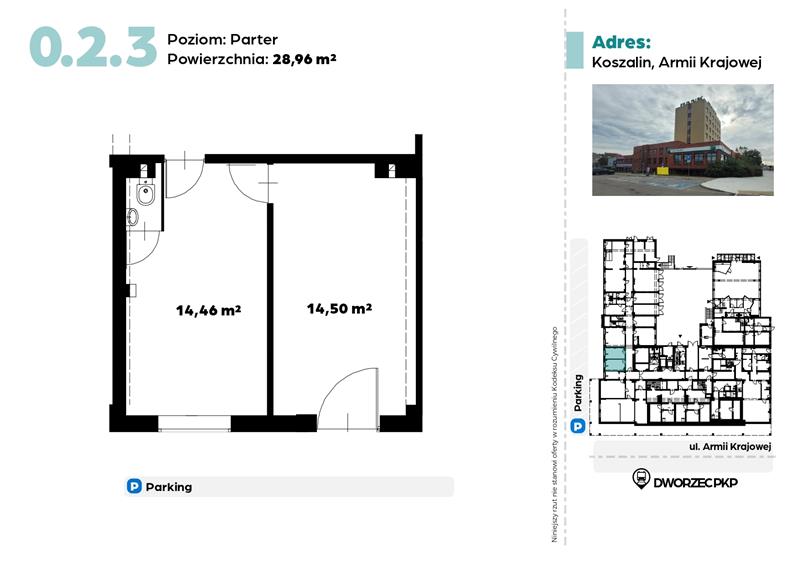 Powierzchnia 28,96 m2, składają się z dwóch pomieszczeń oraz miejsca na węzeł sanitarny.