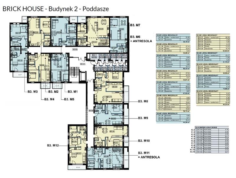 Mieszkanie B3.M7 składa się z salonu połączonego z aneksem kuchennym o pow. 35.23 m2, łazienki o pow. 4.71 m2 i korytarza o pow. 4.56 m2.