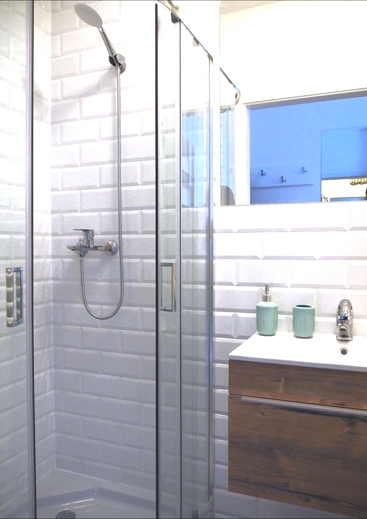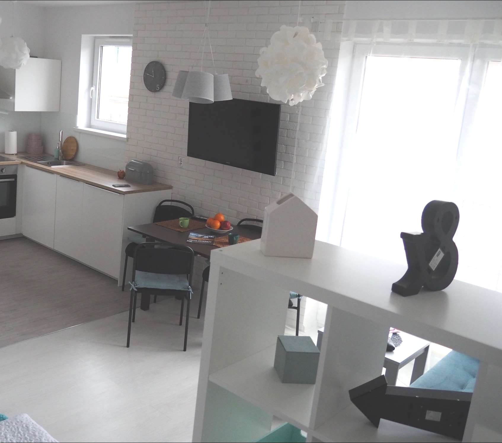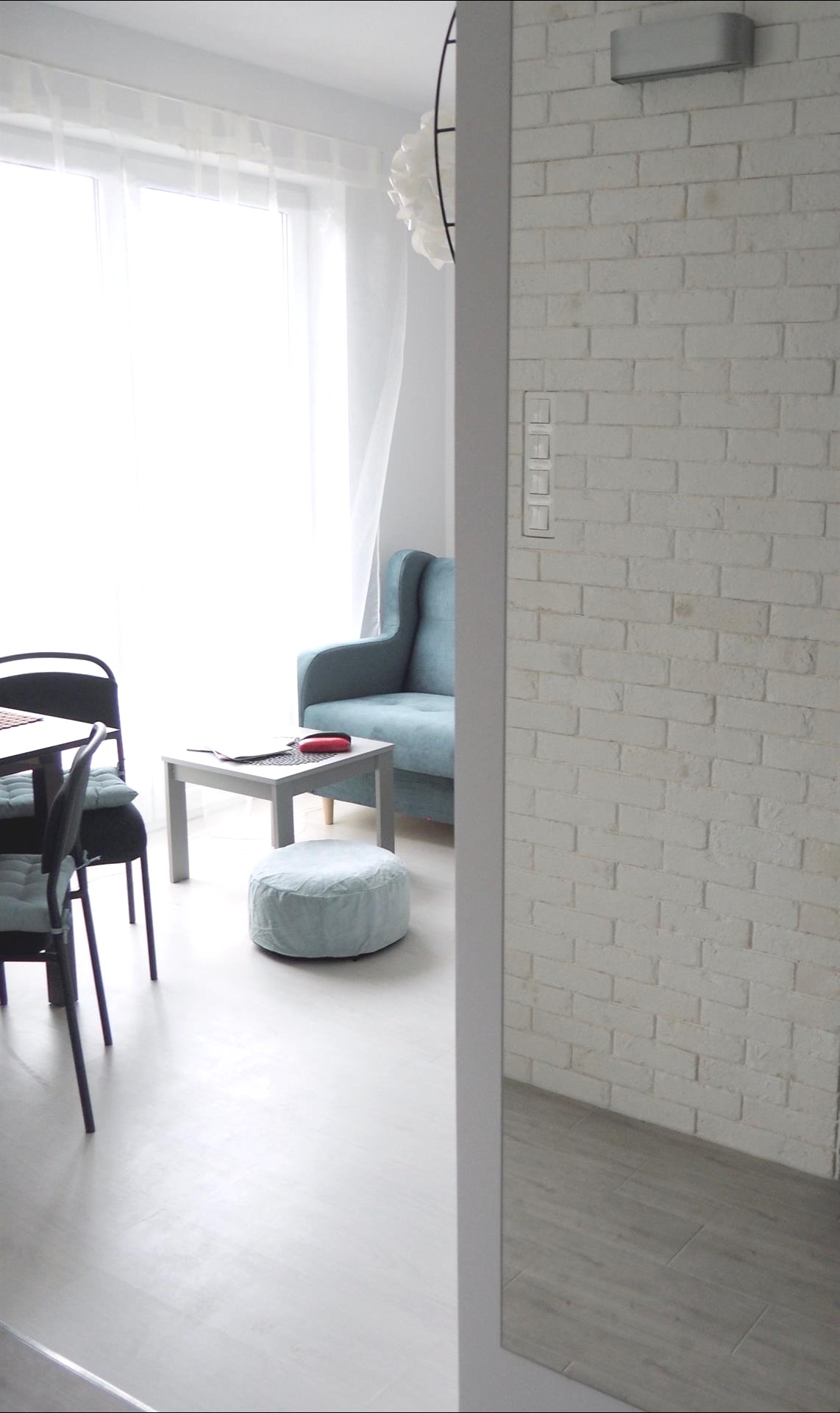 Jasna kolorystyka i biała cegła dodają wnętrzu charakteru i przytulności.