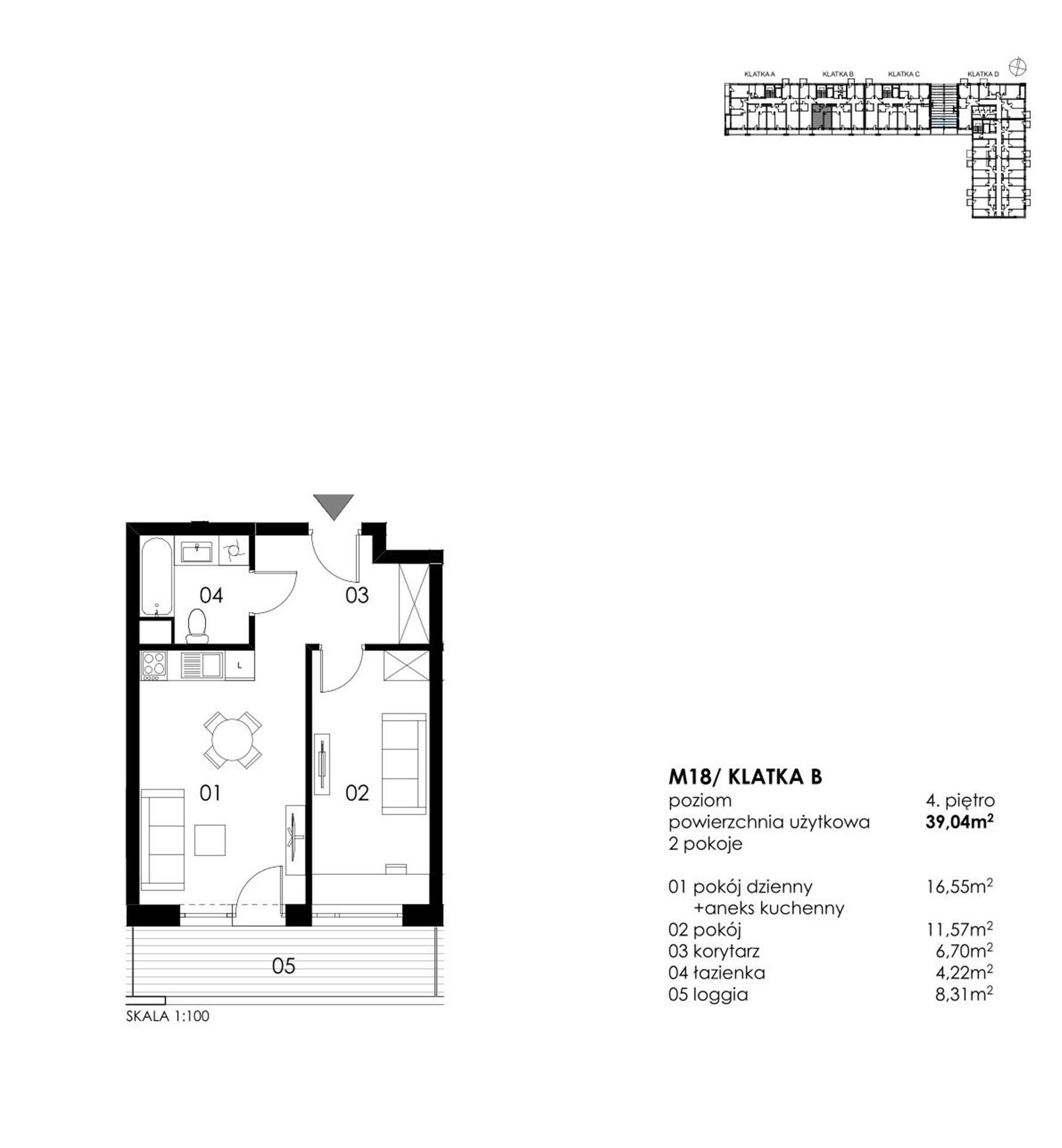Ta oferta dotyczy mieszkania 2 - pokojowego na czwartym piętrze o powierzchni 39,04m2 z loggią, podana cena w ogłoszeniu to już cena brutto.