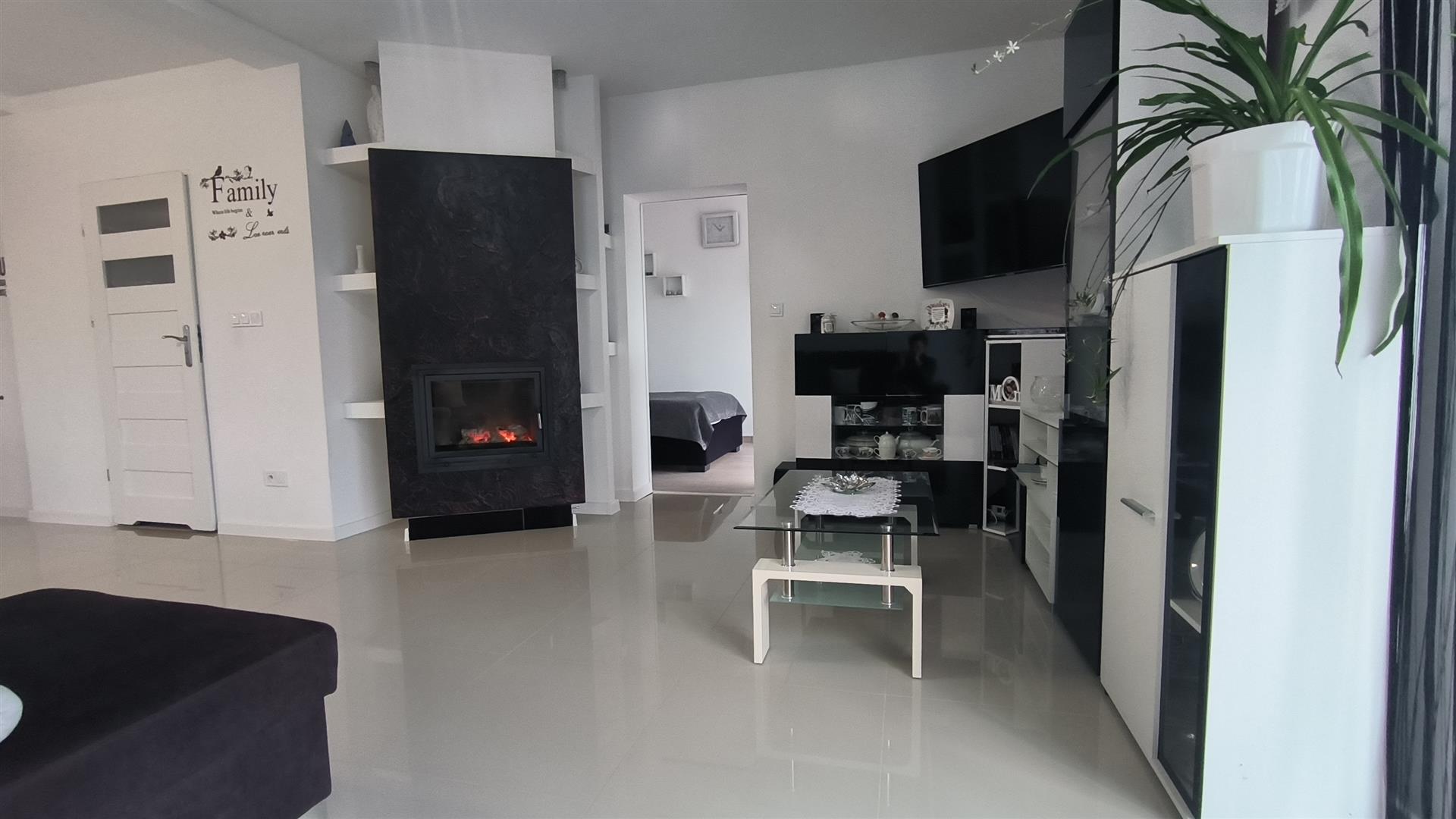 Przytulny kominek w salonie, który jest połączony z systemem rozprowadzenia ciepła do wszystkich pomieszczeń na piętrze, oferując ciepło i przyjemny klimat w zimowe dni.