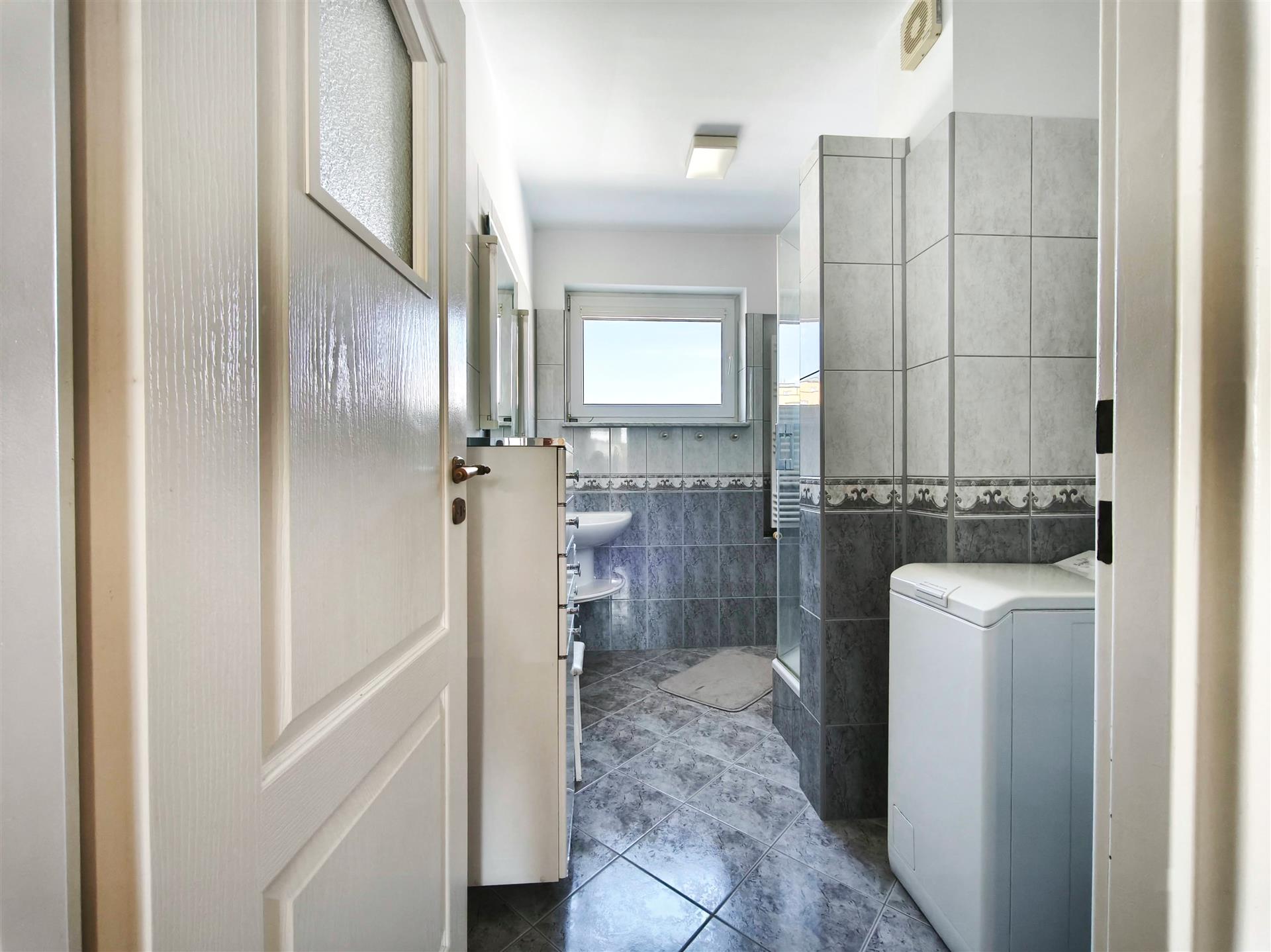 - duża łazienka z oknem, wyposażona w kabinę prysznicową, umywalkę oraz pralkę