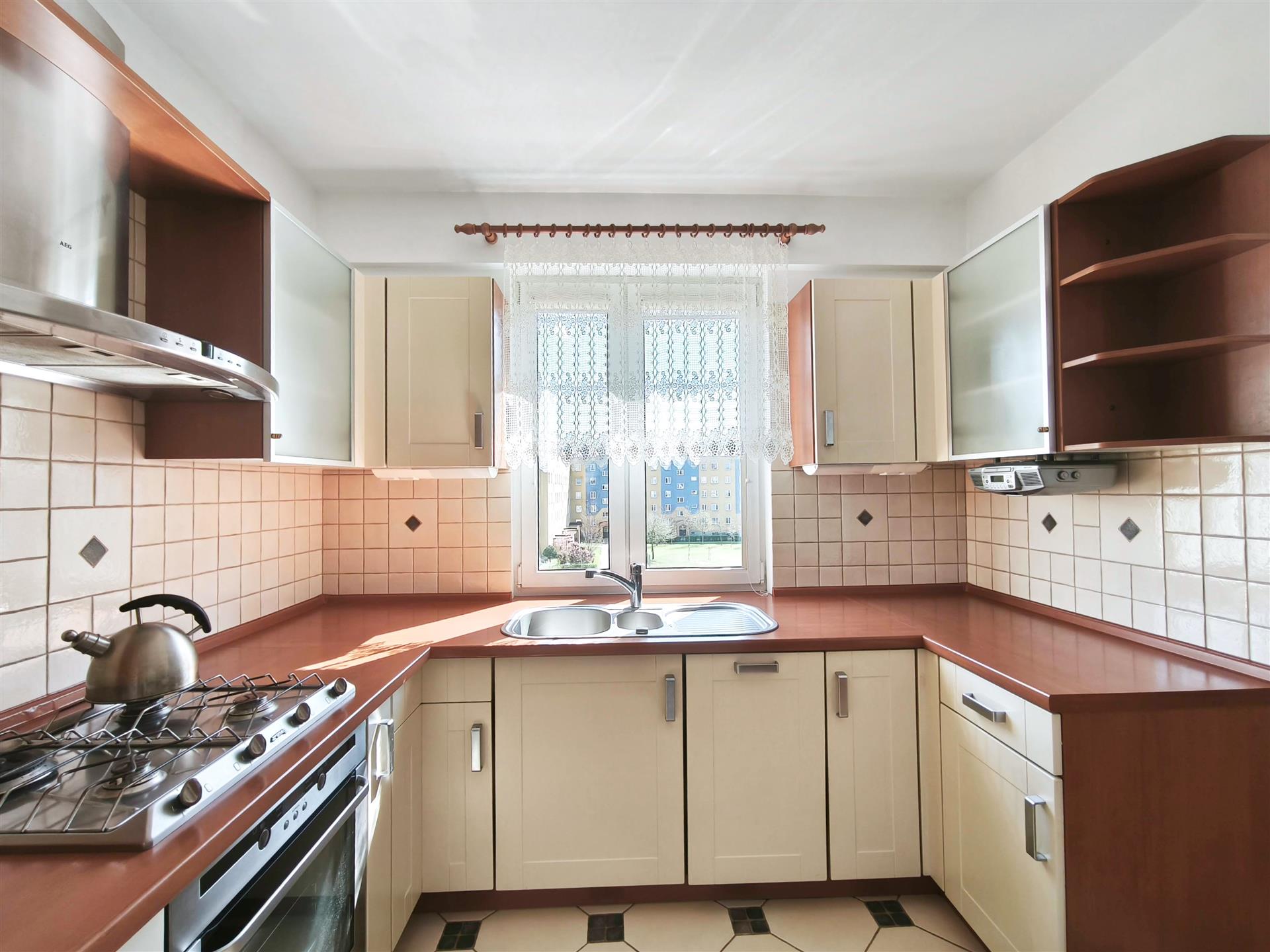 - otwarta, umeblowana kuchnia, wyposażona w wysokiej klasy sprzęt AGD: zmywarkę, lodówkę, okap, piekarnik oraz płytę gazową