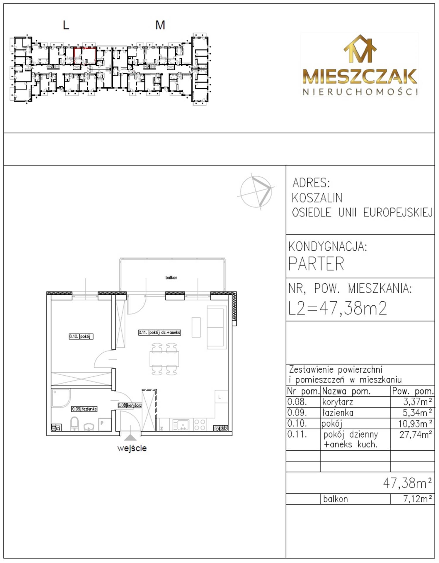 Nowoczesny dwupokojowy apartament (L2) o powierzchni 47,38 m2 położony na parterze w nowoczesnym 3-piętrowym budynku. Składa się z: