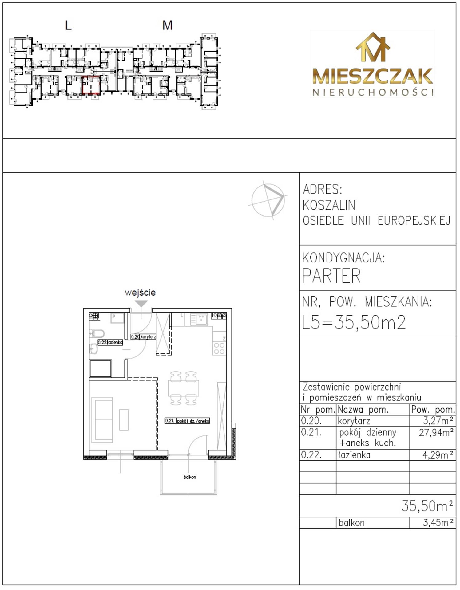 Nowoczesny jednopokojowy apartament (L5) o powierzchni 35,50 m2 położony na parterze w nowoczesnym 3-piętrowym budynku. Składa się z: