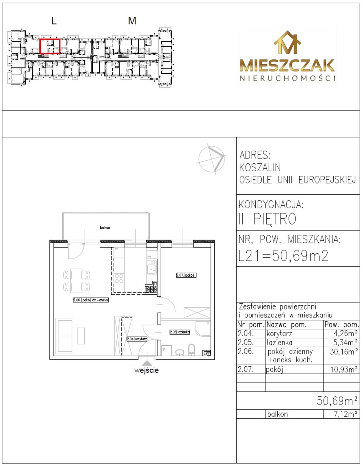 Nowoczesny dwupokojowy apartament (L21) o powierzchni 50,69 m2 położony na drugim piętrze w nowoczesnym 3-piętrowym budynku. Składa się z: