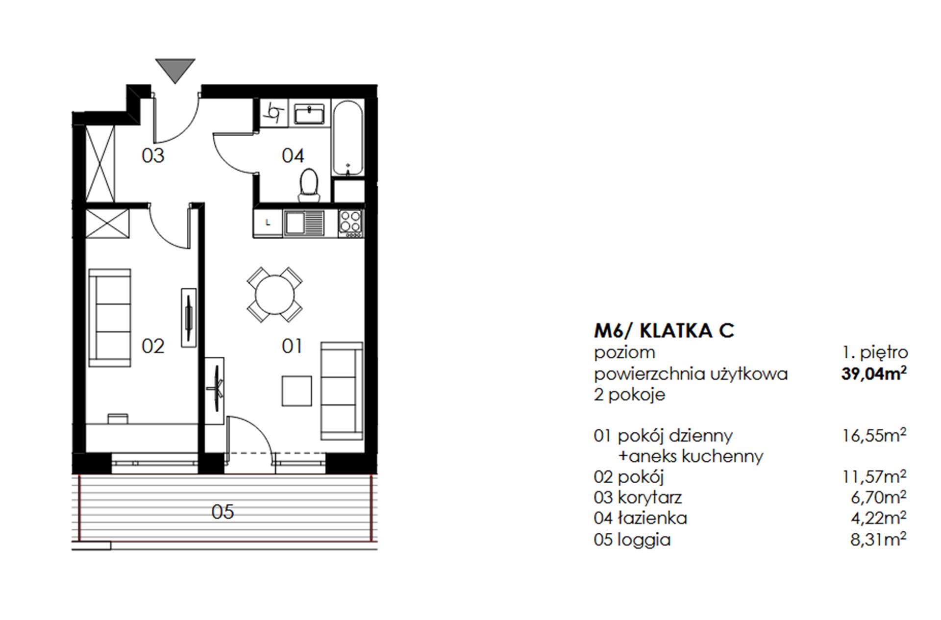 Ta oferta dotyczy mieszkania 2 - pokojowego na pierwszym piętrze o powierzchni 39,04 m2 z loggią. Podana cena jest ceną brutto.