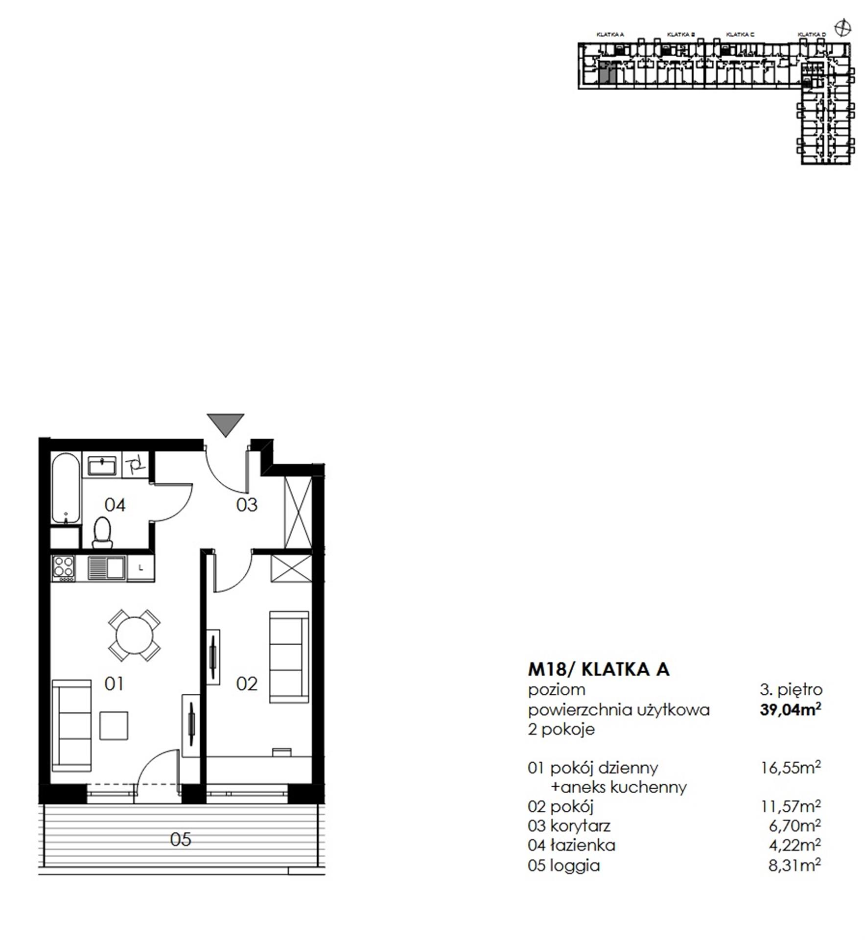 Ta oferta dotyczy mieszkania 2 - pokojowego na trzecim piętrze o powierzchni 39,04 m2 z loggią. Podana cena jest ceną brutto.