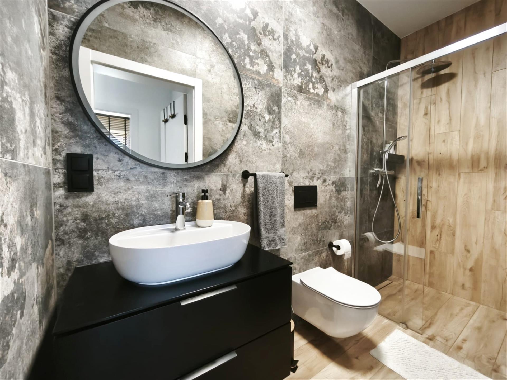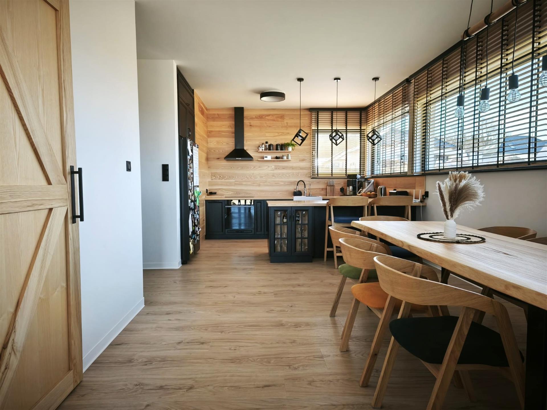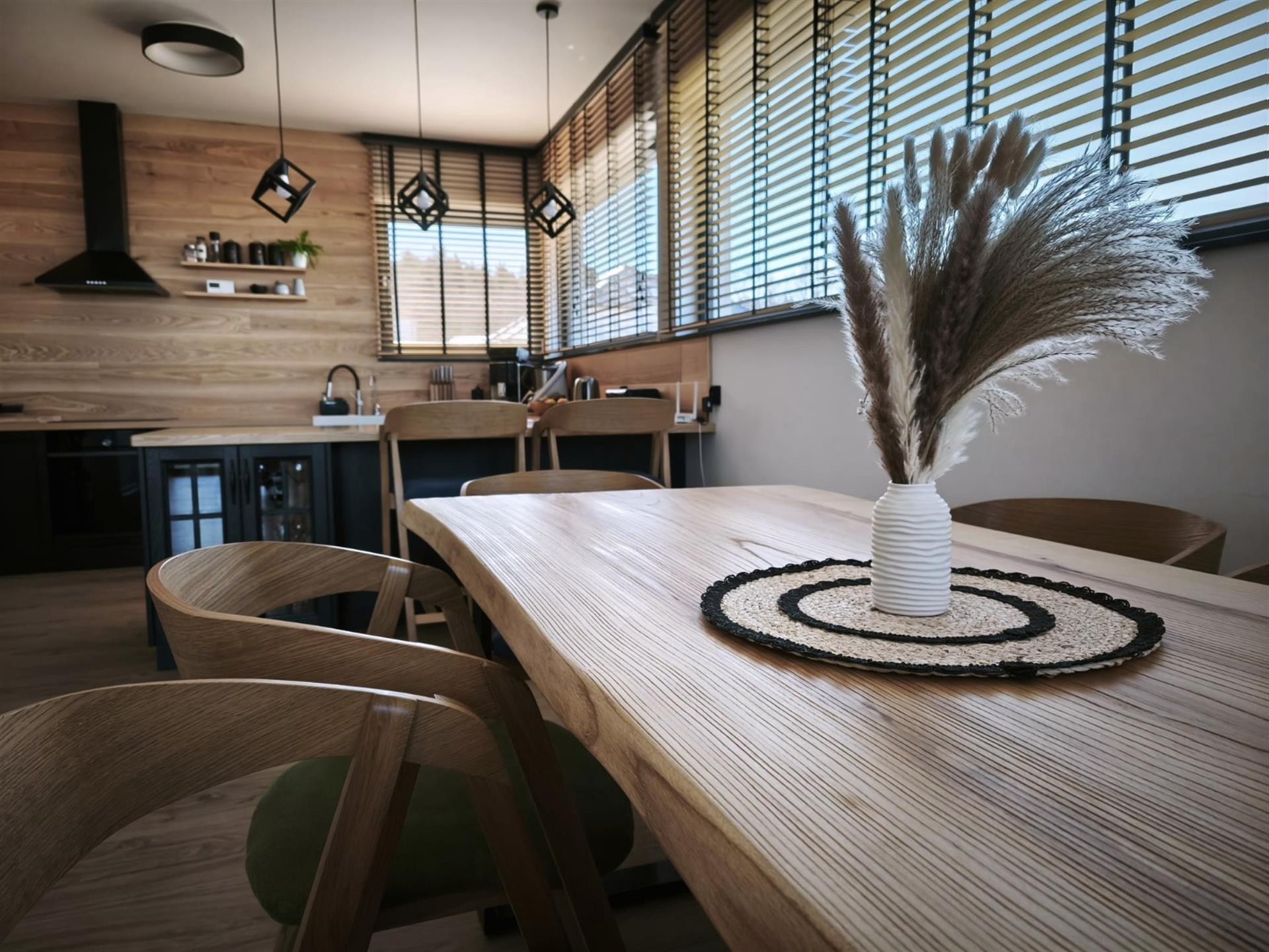Przemyślany układ pomieszczeń gwarantuje wygodę i funkcjonalność. Na parterze znajduje się reprezentacyjny, przestronny salon, który stanowi serce całego domu. To idealne miejsce na rodzinne chwile, relaks przy kominku czy spotkania z gośćmi w wyjątkowej atmosferze. Duże przeszklenia nadają wnętrzu prestiżowego charakteru, wpuszczając mnóstwo naturalnego światła i podkreślając piękno drewnianego wykończenia. Kolejnym pomieszczeniem jest jadalnia oraz kuchnia wykonana na zamówienie z naturalnego drewna, uzupełniona praktyczną spiżarnią. Kolejną przestrzeń parteru zajmują dwa pokoje (w tym jeden z garderobą), łazienka z prysznicem oraz kotłownia z pralnią i pomieszczenie gospodarcze z wyjściem na ogród. Na uwagę zasługuje również duży hall z pojemnymi szafami w zabudowie.