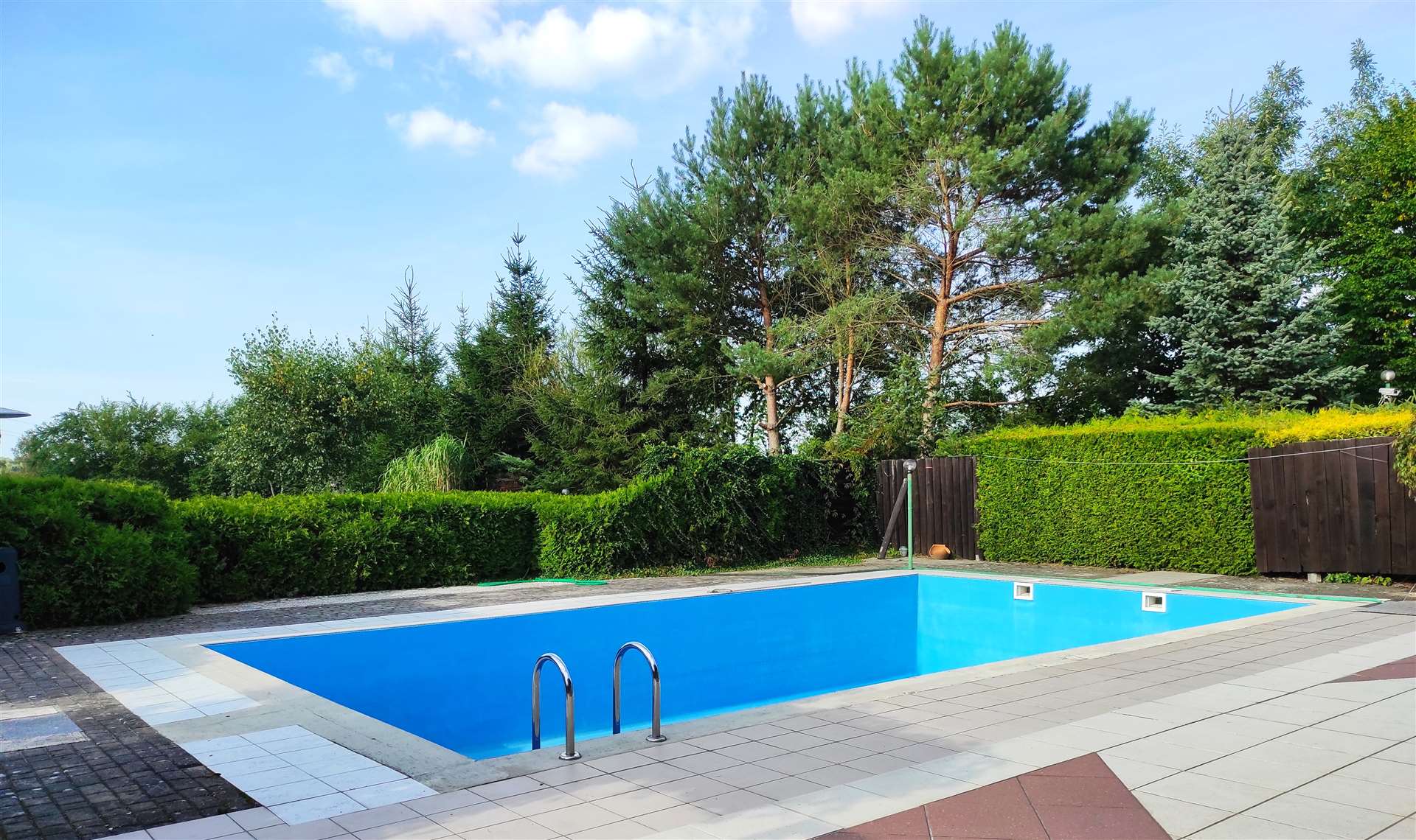 Dodatkowym atutem nieruchomości jest jej położenie na bardzo dużej, pięknie zagospodarowanej działce o powierzchni ponad pół hektara. Na terenie posesji znajduje się basen kąpielowy oraz staw, co dodatkowo podnosi atrakcyjność tego miejsca. Cisza, spokój, zieleń i bliskość natury sprawiają, że ten dom staje się idealnym miejscem do wypoczynku i relaksu po intensywnym dniu.